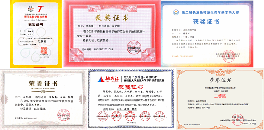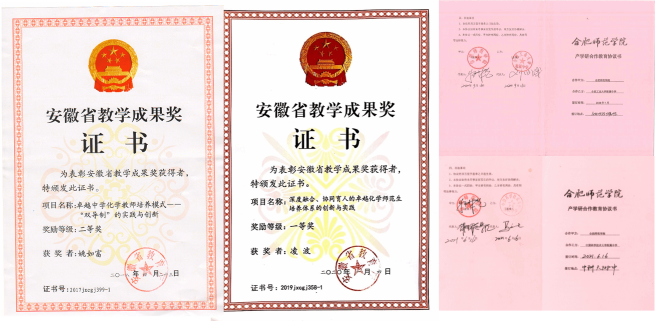 3)实践教育平台不断夯实。我校与合肥市经开区、包河区签订了U-G-S战略合作协议,通过高校、地方政府及中学共建有附属实验中学,本专业选派4位教师前往中学挂职副校长,并建有两所省级合作实践教育基地。专业拥有省级化学示范实习实训中心。深度融合、协同育人的校内外双导师化学师范生培养体系的创新与实践获安徽省教学成果一等奖。