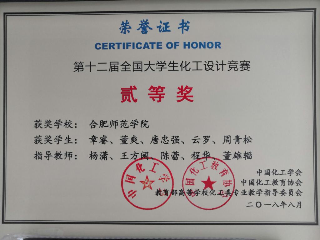 近日,我校学生在中国化工学会、中国化工教育协会和教育部高等学校化工类专业教学指导委员会联合主办的第十二届全国大学生化工设计竞赛中获二等奖。