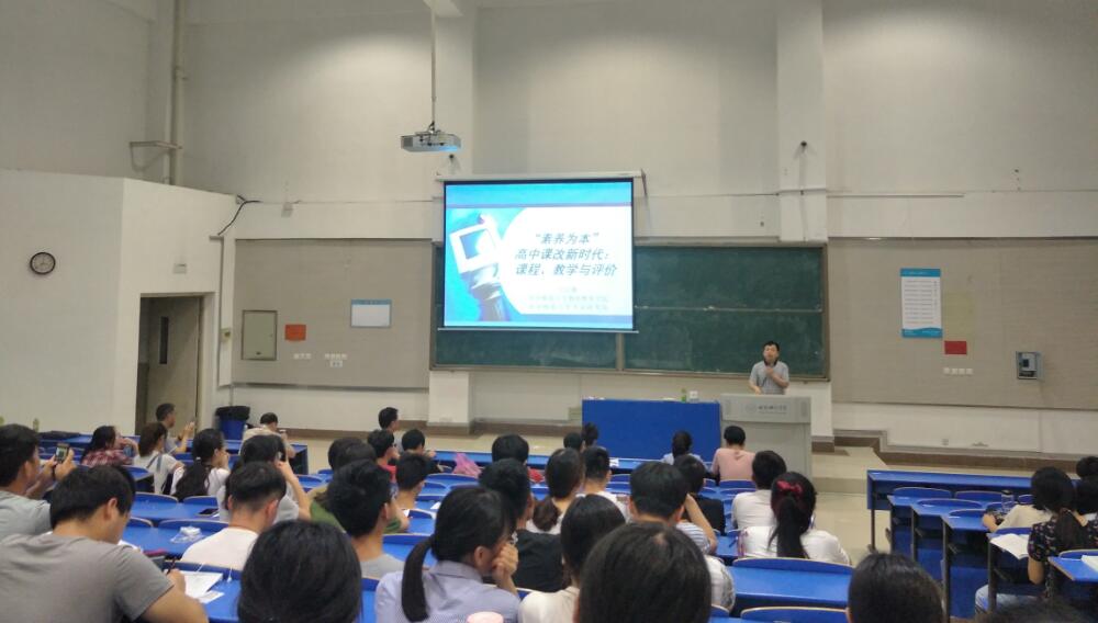【本网讯】  5月17日晚,为提升新时代师范生素养,化学与化学工程学院、姚如富名师(大师)工作室邀请化学教育专家、华中师范大学博士研究生导师王后雄教授于我校锦绣校区逸夫楼西街二教室开展题为“‘素养为本’高中课改新时代:课程、教学与评价”讲座。化学与化学工程学院姚如富教授参加讲座,2015级、2016级、2017级化学(师范)专业本科生及学科教学(化学)专业研究生全体聆听讲座内容,王庆林老师主持。