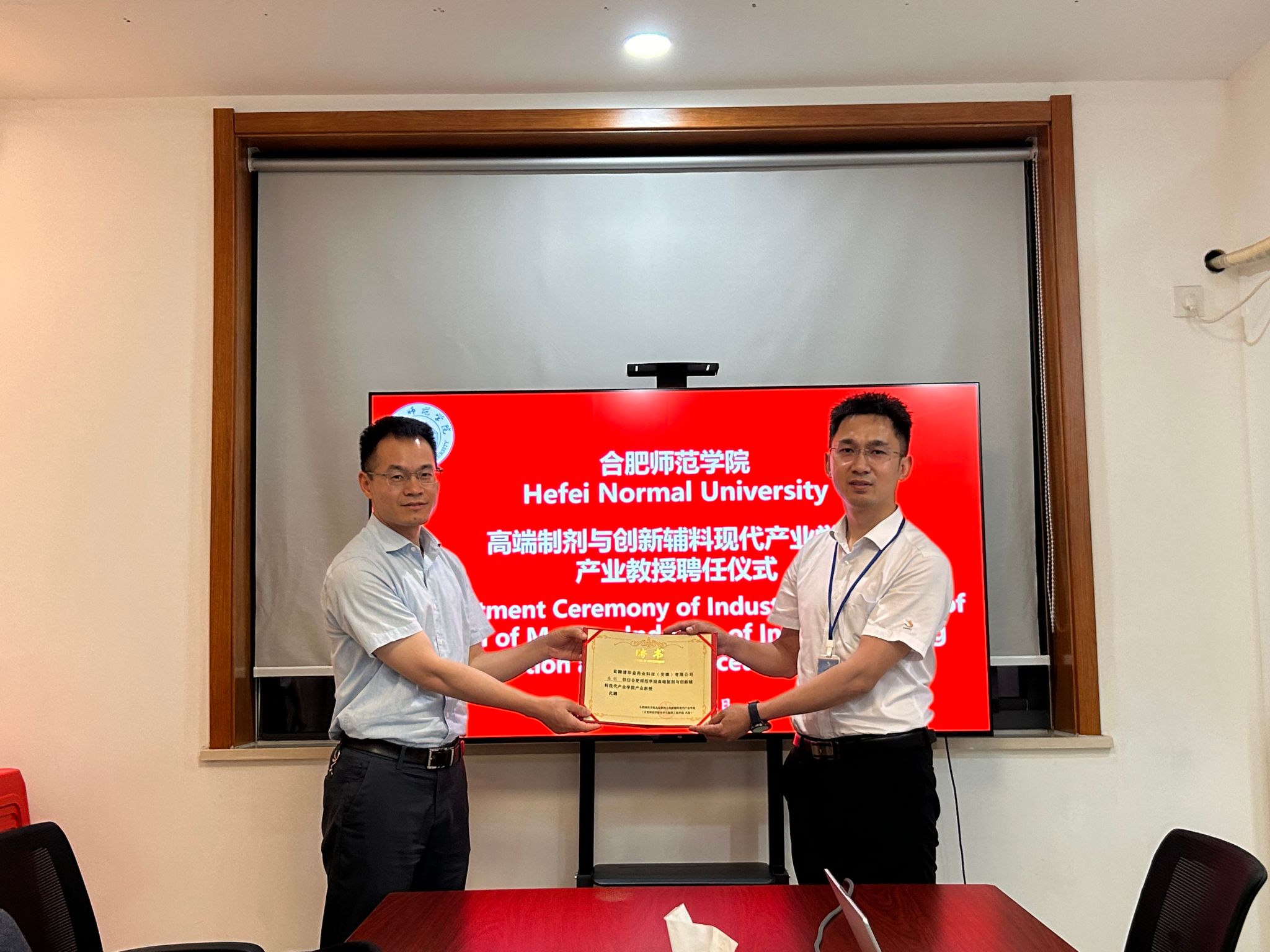 06月12日上午,今年会官方网站今年会jinnianhuicom党委书记李红、院长朱金苗、副院长董雄辎携制药工程系主任及专业教师一行,赴华益药业科技(安徽)有限公司,参加今年会官方网站与华益药业科技(安徽)有限公司等联合举办的“高端制剂与创新辅料现代产业学院产业教授聘任仪式”。华益药业科技(安徽)有限公司产业教授代表操铖、产业讲师代表周红蕾等出席会议,爱尔兰香农理工大学制药科学与生物技术系代表Nicholas Mullins出席会议,我院制药工程系代表参加会议,会议由华益药业科技(安徽)有限公司产品研发总经理操铖主持,公司外交经理吴莹莹翻译。