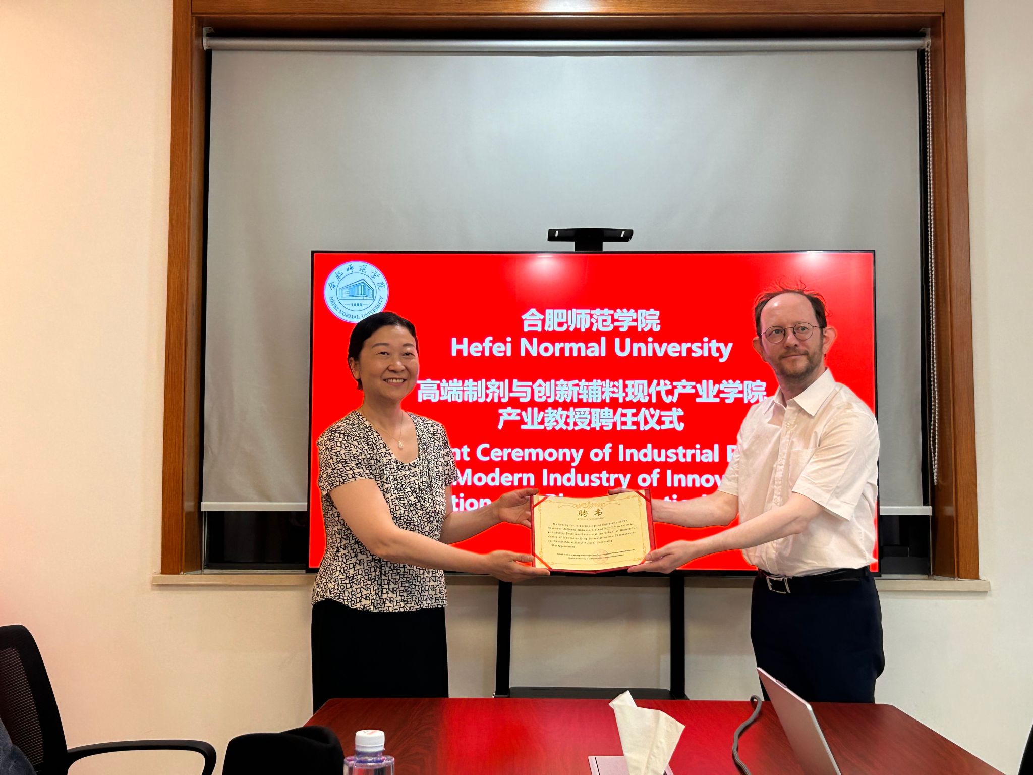 交流会上,操铖和吴莹莹首先详细介绍了华益药业科技(安徽)有限公司在技术创新、人才培养等方面取得的成果。朱金苗、Nicholas Mullins相互介绍了双方共同推动产业学院工作中取得的成绩。产业学院为爱尔兰高校和企业代表授予了产业教授聘书。