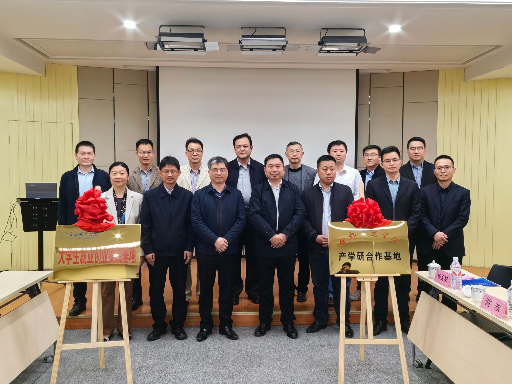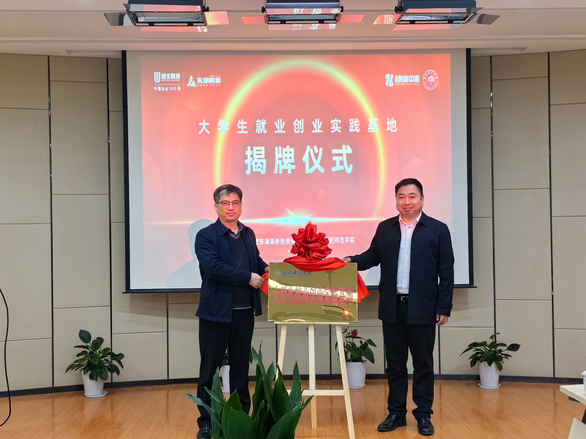 会后,华银峰与安徽新力电业科技咨询有限责任公司、安徽威达环保科技股份有限公司等4家企业代表进行“大学生就业创业基地”和“产学研合作”的揭牌仪式,