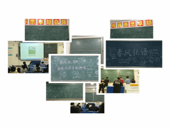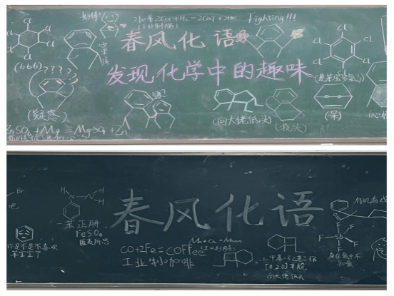 “春风化语”活动集艺术表达、沟通交流、体验感悟于一身,属于一项综合性的心理体验活动。活动要求各班级心理委员牵头组织班级同学共同参与,以“春风化语”为主题,运用化学语言、化学符号、化学表情包等,在黑板上自由创作绘制文艺作品,抒发内心情感、表达美好祝福。