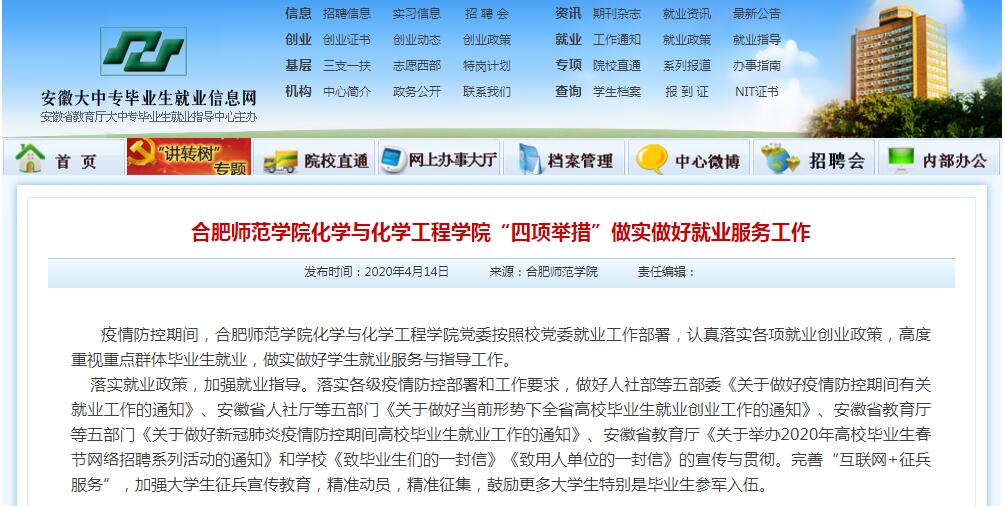 本网讯 省大中专毕业生就业信息网报道我院就业工作“今年会官方网站化学与化学工程学院“四项举措”做实做好就业服务工作”。