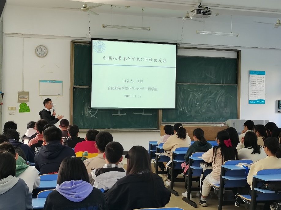 本网讯 2020年11月12日下午,制药工程系李亮博士在博约楼109教室作专题为“机械化学条件下的C-H活化反应”学术报告,2020级制药工程专业全体学生参加学术报告会。