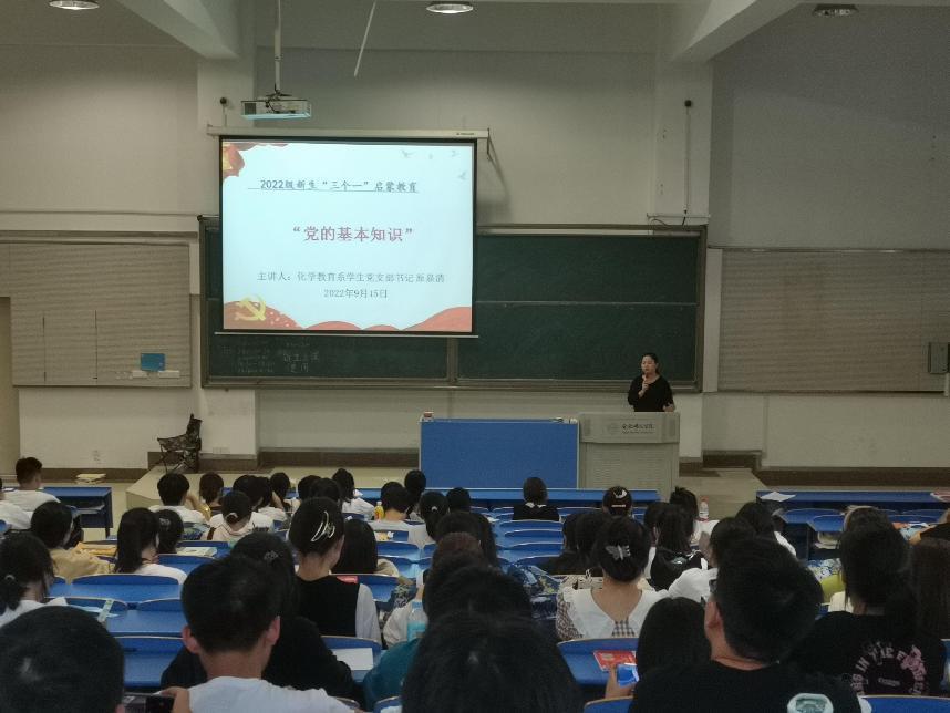 9月15日在逸夫楼西阶6,化学教育系学生党支部书记带领2022级新生学习习近平总书记“七一”重要讲话精神,全面回顾了党的百年历史。通过党史的学习,帮助同学们树立起勇做民族复兴重任的时代新人的责任感,将个人理想融入中国梦中。接着向新生普及入党流程,端正学生入党动机,提升政治觉悟,引导新生积极向党组织递交入党申请书。