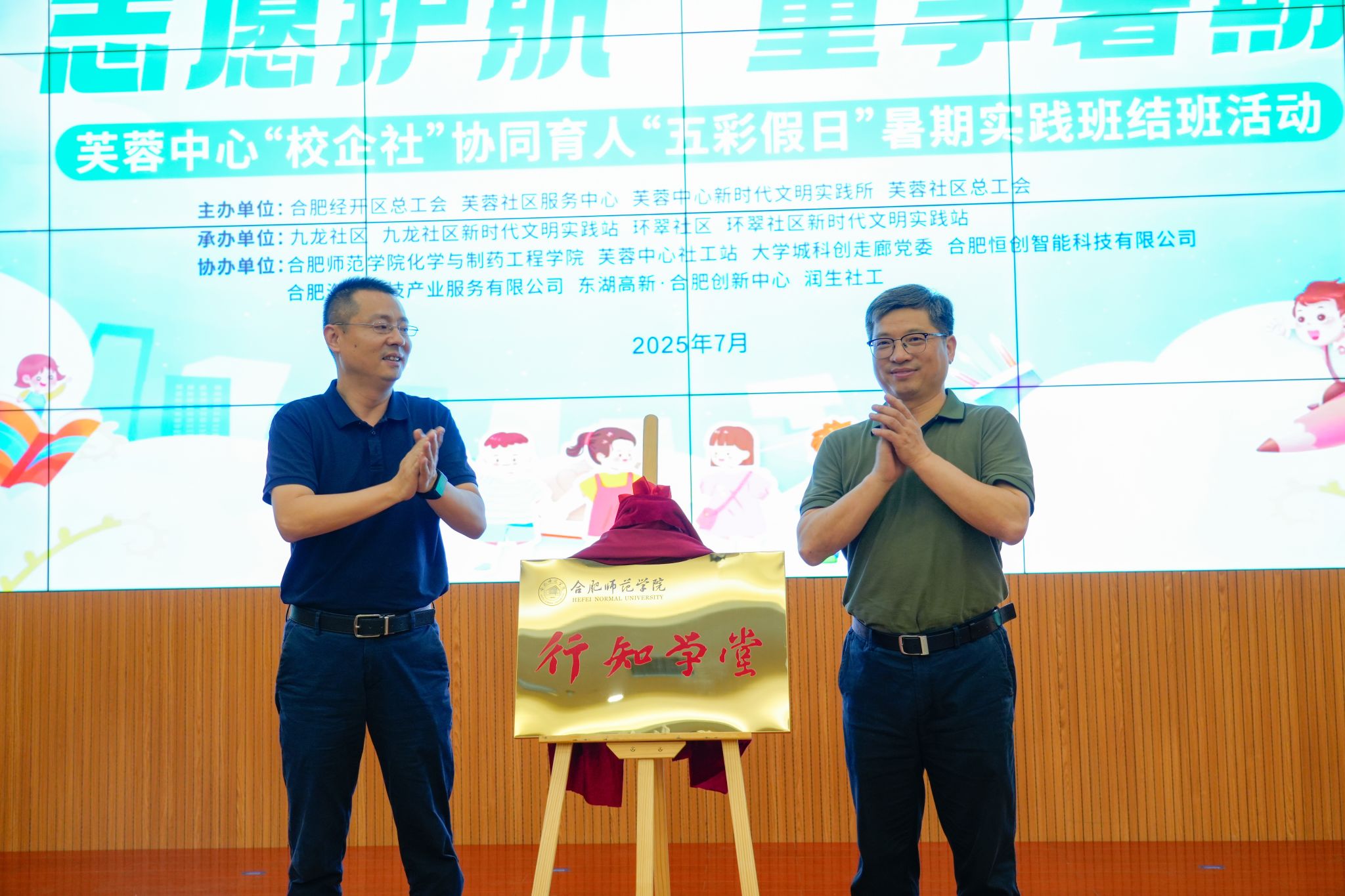 合作共建环节,华银峰与冯巍为高校三创园“行知学堂”社会实践基地揭牌。