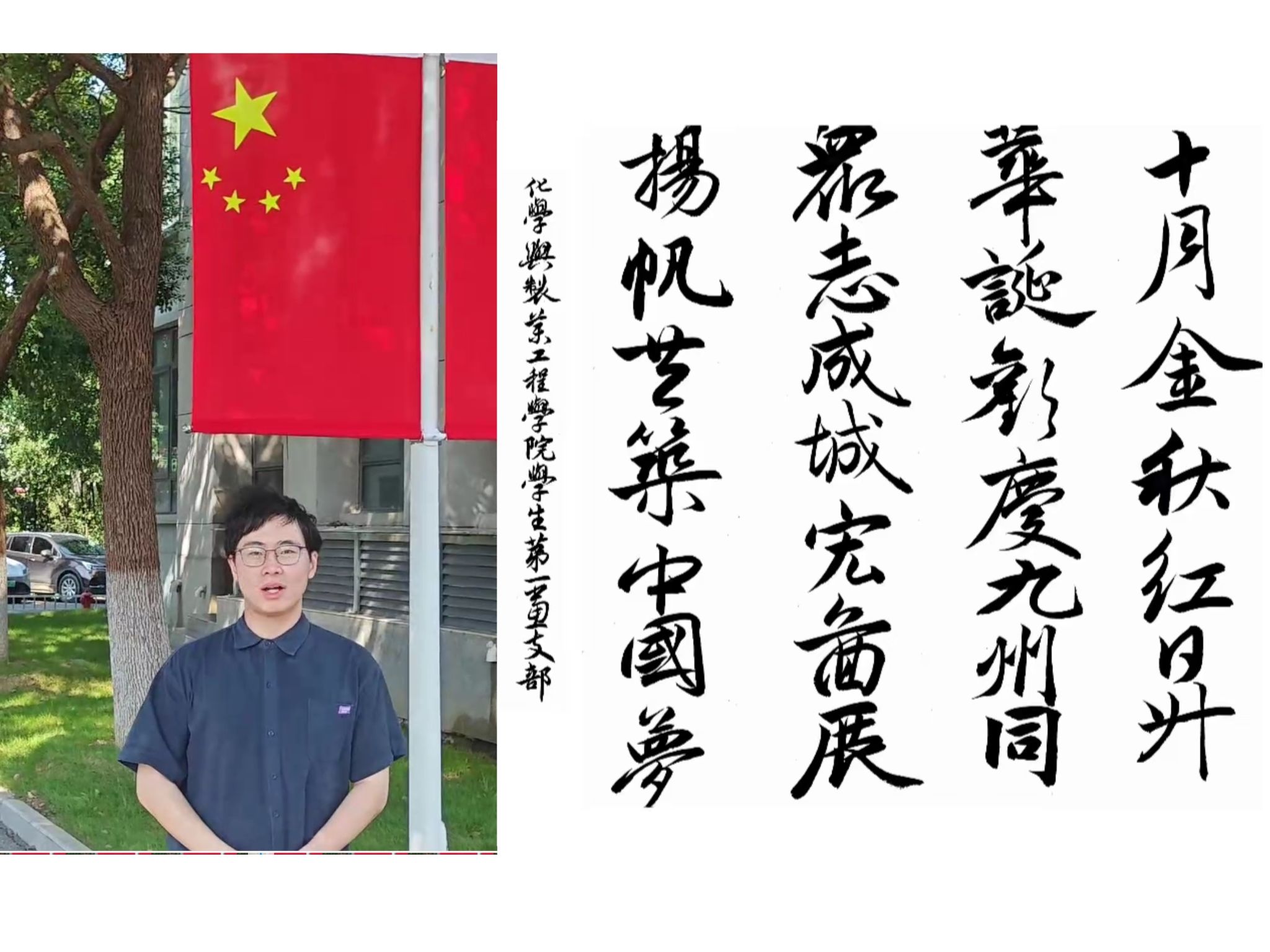 假期期间,支部党员积极参与,他们与家人、朋友们在各地通过与国旗同框、与国庆元素合影等朴素方式,用镜头定格一幕幕动人瞬间,用实际行动表达对祖国的热爱与祝福。其中,扈冬冬同学更以传统书法寄情,写下:“十月金秋红日升,华诞欢庆九州同,众志成城宏图展,扬帆共筑中国梦”原创诗句,笔触间既有对祖国壮丽山河的深情,也饱含着青年一代对民族复兴的坚定信念,成为此次活动中一抹独具韵意的青春表达。